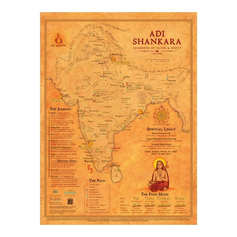 "Step into the profound journey of Adi Shankara with this exquisitely illustrated map that traces the path of his enlightenment across Bharat. Each landmark is rendered with gentle artistry, echoing the depth of his teachings and the places where his timeless philosophy blossomed. Graceful, calming, and deeply inspiring, this map brings a quiet sense of clarity and devotion to your space — a daily reminder of Adi Shankara’s guiding light, his unifying vision, and the spiritual awakening.